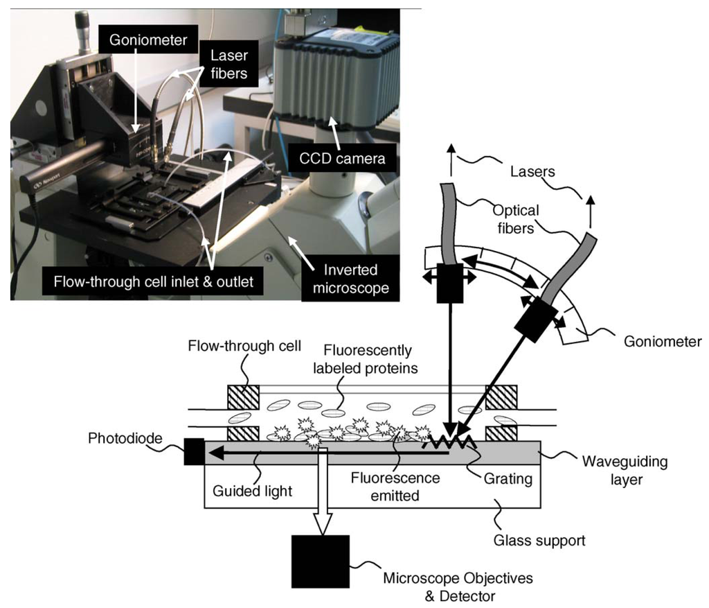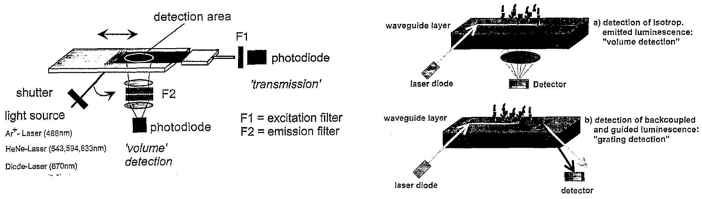 For highly surface sensitive, dynamic and quantitative in-situ analysis of processes on bio-interfaces Grandin et al. developed a biosensing platform, the Waveguide Excitation Fluorescence Microscope (WExFM). Based on fluorescence excitation by an evanescent field the system represents an add-on to a standard inverted microscope offering high target sensitivity for fluorescence detection (femtomolar range), multicolor, in-situ, temporal resolution as well as large area analysis with submicron resolution and a “built in”-calibration of fluorescent light gain. Laser light is coupled into a planar waveguide (Microvacuum: SixTi(1-x)O2 with x ≅ 0.25; refractive index n = 1.77; thickness d = 200 nm or Zeptosens: Ta2O5 with n ≈ 2.2; d ≈ 150 nm) of this system by an optical grating at a specific angle found by scanning a goniometer (Figure 13). A shift of the refractive index due to the adsorption of molecules or changes in the ambient solution are determined by measuring the incoupling angle similarly to the system by Tiefenthaler et al. [, ]. Incoupled light travelling along the waveguide is detected by a photodiode arranged at its end. Light within the evanescent field (ca. 100-200 nm) excites fluorescent molecules, e.g. labeled proteins, bound to the surface. The illuminated area is ca. 1 mm x 20 mm. Since the sample remains stationary the system is especially suitable for imaging applications. Furthermore, multicolor experiments are feasible because of co-incident laser beams of different wavelength. The detection is carried out via the microscope objective and a CCD camera or a photo multiplier tube, not limited to any magnification. As a result of their experiments Grandin et al. reported a detection limit < 1 ng/mL (< 20 pM) in case of Alexa Fluor 488 labeled streptavidin (Molecular Probes, Netherlands) [].