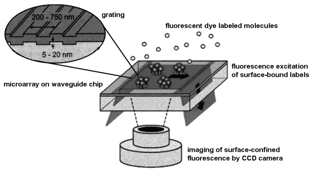 Detection principle of evanescent field fluorescence on planar waveguides (principle of ZeptoREADER): excitation light is coupled into a thin-film waveguide; surface confined fluorescence of bound labeled molecules is detected by a CCD camera. Adapted from [, ]