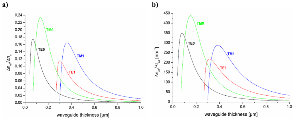 versus waveguide thickness for the first two TE-and TM modes (0 and 1). It can be seen that TM modes yield higher sensitivities for the given parameters and that a waveguide thickness of 150-160 nm should be optimal for TM.