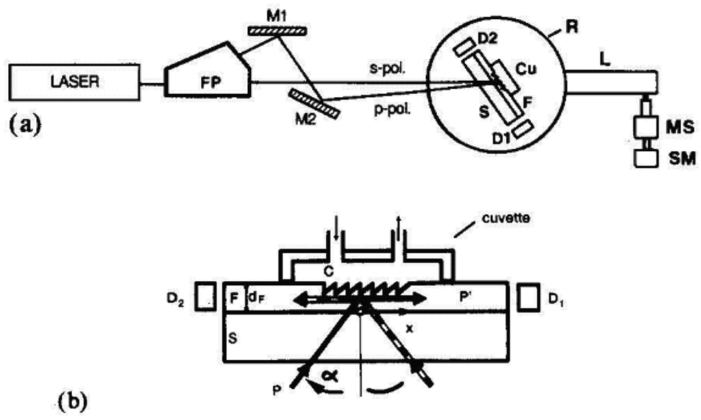 (a) Schematic of the input grating coupler instrument. In an angular scan, the TE0 and TM0 modes are successively excited by an s- and a p-polarized laser beam. L = lever arm; MS = micrometer screw; SM = stepping motor; Cu = cuvette; Laser = He-Ne laser (λ = 632.8 nm); FP = Foster prism; M1 and M2 = mirrors; P = incident power; P′ = power of incoupled guided mode; α = angle of incidence; D1 and D2 = silicon photodetectors. (b) Detailed view of the sensor: C = liquid cover; F = waveguiding film of thickness dF on glass substrate S. From [], Copyright Elsevier (1990).