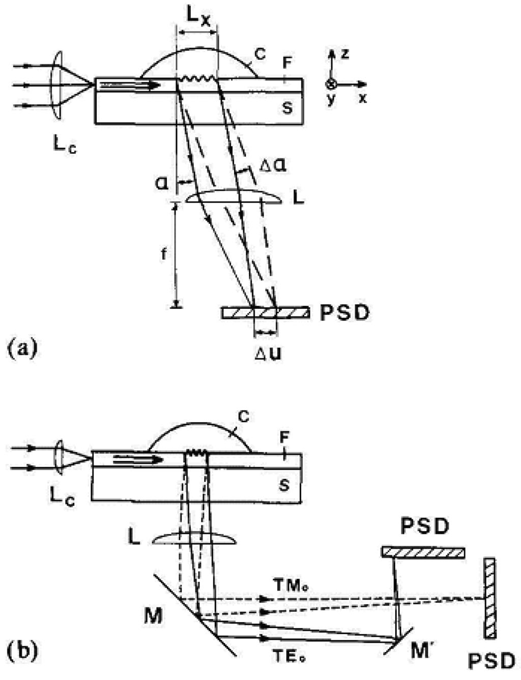 (a) Schematic of output grating coupler sensor; F = waveguide; S = substrate; C = sample; Lc = cylindrical lens of short focal length fc (e.g. fc = 5 mm); L = cylindrical lens of focal length f (e.g. f = 300 mm); α = outcoupling angle; Δα = change in outcoupling angle proportional to the effective index change Δn; PSD = position-sensitive-detector; Δu = displacement of centre of the light spot on the PSD. (b) Schematics of output grating coupler measuring the effective index changes Δn(TE0) and Δn(TM0) of the TE0 and TM0 modes; M, M′ = mirrors. From [], Copyright Elsevier (1990).