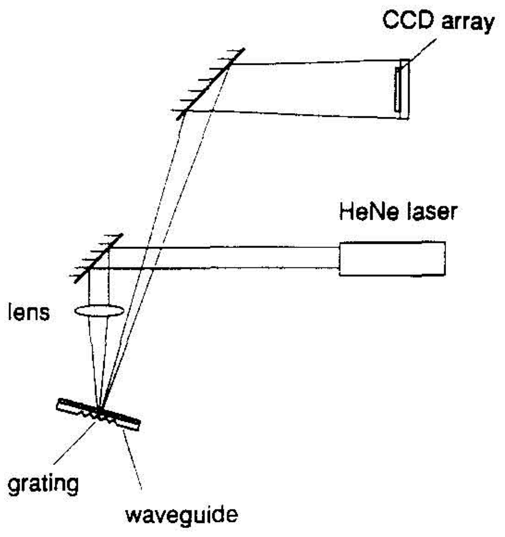 To overcome such limitations, Brandenburg et al. developed an integrated optical grating coupler in reflected-mode operation having the advantage that no critical alignments for coupling light into the waveguide were necessary and that any moving parts could be avoided. The system, at first implemented using TiO2- and SiO2- waveguides, was applicable in humidity sensing with a resolution of Δneff, min = 1 x 10-5 []. In 1996, Brandenburg et al. reached a resolution of about Δneff, min = 3 x 10-6 in reflected-mode operation with an integrated optical grating coupler based on Ta2O5-waveguides. They calculated a detection limit of 0.2 μg/mL or 1.4 x 10-9 M for human IgG using protein G as capture molecule []. The set-up is shown in Figure 7. A laser beam is focused by a lens onto an embedded grating in a Ta2O5-waveguide layer, thereby creating a continuum of coupling angles. The optical device is arranged in order to cover all coupling angles in the range of 0.7° expected during the measurement. Only the light obeying the coupling condition (eq. 16) is coupled into the waveguide, such that in the reflected beam a dark line corresponding to the coupling angle at the measured effective refractive index can be observed. On a CCD array the reflected light is detected and in the resulting intensity distribution the minimum position is determined.