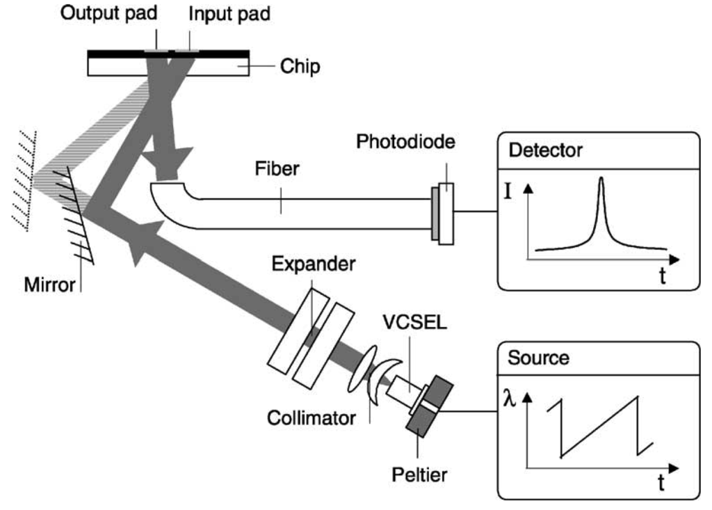 Cottier et al. [] presented the wavelength interrogated optical sensor (WIOS) which includes both in- and outcoupling of a wave by means of a grating (Figure 8). A vertical cavity surface emitting laser diode (VCSEL) with a saw-tooth wavelength modulation served as a laser source. The collimated laser beam is directed by a mirror towards the input pad for coupling and travels along the waveguide. An output pad couples the light out that is finally collected by a multi-mode fiber and detected by a photodiode.