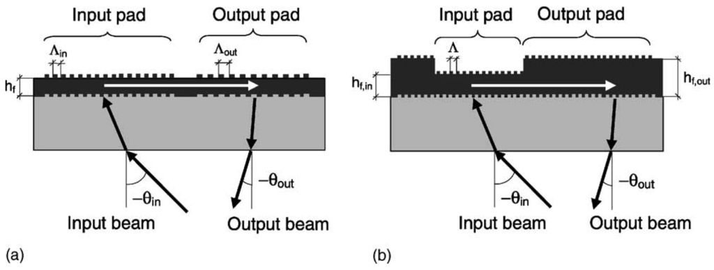 (a) Cut through dual period sensor chip. (b) Cut through thickness-modulated sensor chip. From [], Copyright Elsevier (2003).