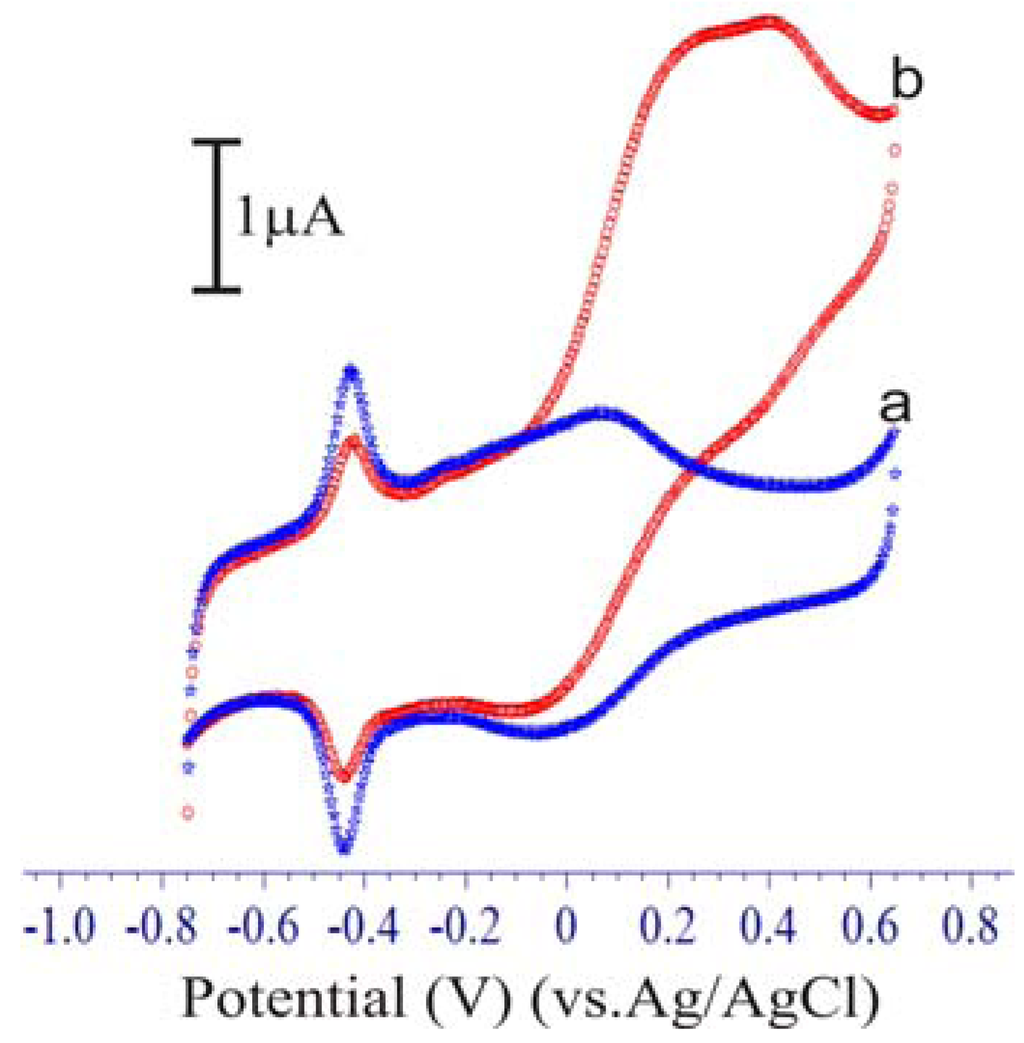 Figure 1. poly(p-amino benzenesulfonic acid)/flavin adenine dinucleotide film modified GCE in the absences (curve a) and presences of 50μM NADH (curve b) in 0.1M phosphate buffer solution (pH 6.4).