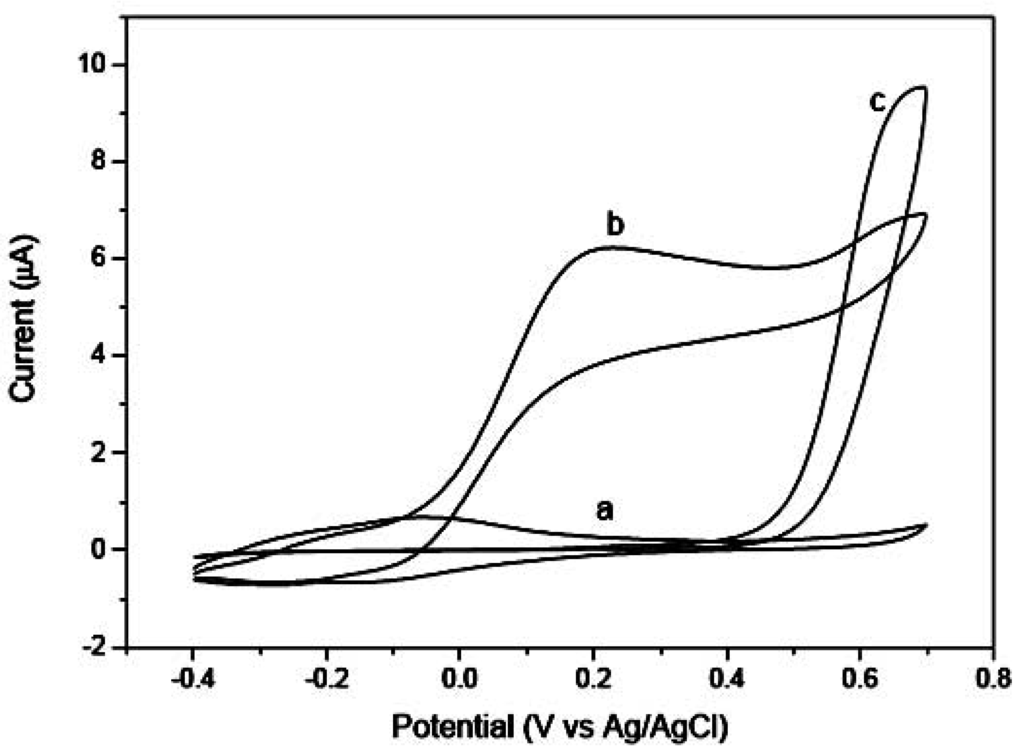 Figure 2. Cyclic voltammograms of (a and b) poly(azure A) modified screen-printed carbon electrode in the absence (a) and presence (b and c) of 1mM NADH. Voltammogram (c) was obtained at a bare screen-printed carbon electrode. Scan rate: 5mVs-1. (Reproduced with permission from Gao et al., Talanta 2004, 62, 477–482)