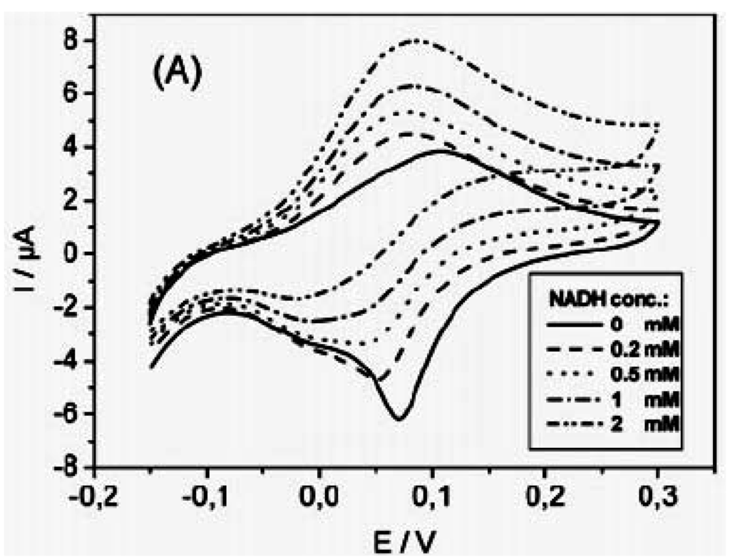 Electrocatalysis of NADH oxidation with the poly-toduiline blue films is reported by the method of CV and the catalytic reaction constant between NADH and poly-toduiline blue is determined by rotation disc electrode measurement. Their experiments proved that the poly-toduiline blue is an excellent catalyst for NADH oxidation, shifted anodic peak potential negatively to 450 mV compared with unmodified GCE, and the rate constant of NADH oxidation on the GCE modified with the poly-toduiline blue films is exponentially greater than on modified GCE [95].