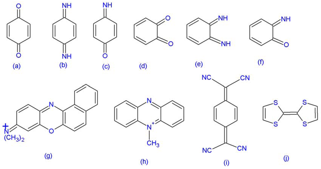 Scheme 3. Basic catalytic functionalities of many organic 2-electron-proton acceptors efficient for catalytic NADH oxidation (a-f). Structural formulae of some commonly used mediators for catalytic NADH oxidation: (g) Meldola blue (p-phenylenediimine). (h) N-methylphenazinium(o-phenylenediimine), (i).TCNQ (tetracyanoquinodimethane), (j) TTF (tetrathiofulvalene).