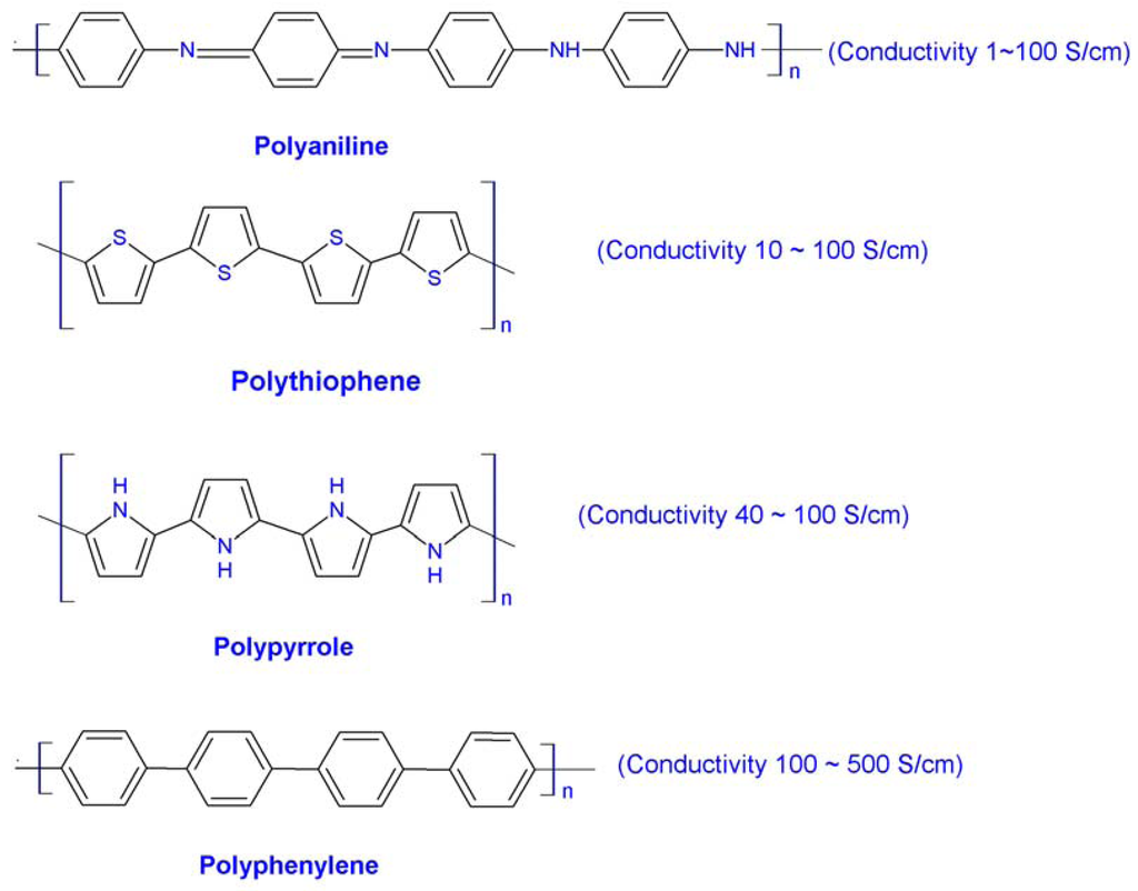 The electronically conducting polymers (ECPs) which covers several types of polymeric materials with electronic and/or ionic conductivity, including (i) doped conjugated polymers, (ii) redox polymers, (iii) polymer composites, and (iv) polymer electrolytes. ECPs as ion selective membrane and their applications in solid-state ion selective electrodes have been reviewed [40]. The most popular members of ECPs such as polyaniline (PANI), polythiophene, polypyrrole and polyphenylene are p-type semiconductors (Scheme 4) [42, 42]. Stability of polymers, conductivity and doping nature has been discussed in several reviews [43-50]. Conducting polymers are promising materials for a large variety of chemical sensors, their preparation and applications as chemical sensors in several aspects have been discussed in many reviews [5176].
