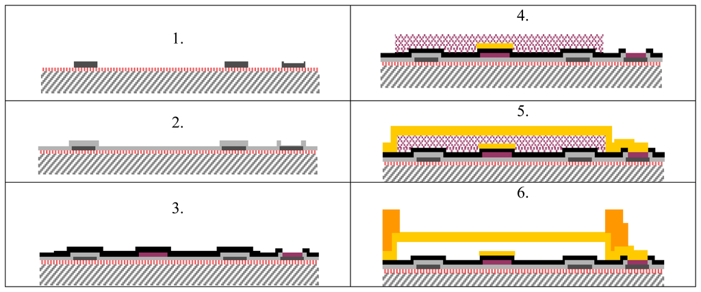 The specimens used for this work were prepared at the ITC-IRST research center (Trento, Italy), using the RF Switch (RFS) Surface Micromachining process, widely described in [,]. The process can be summarized in the following steps (Figure 1):