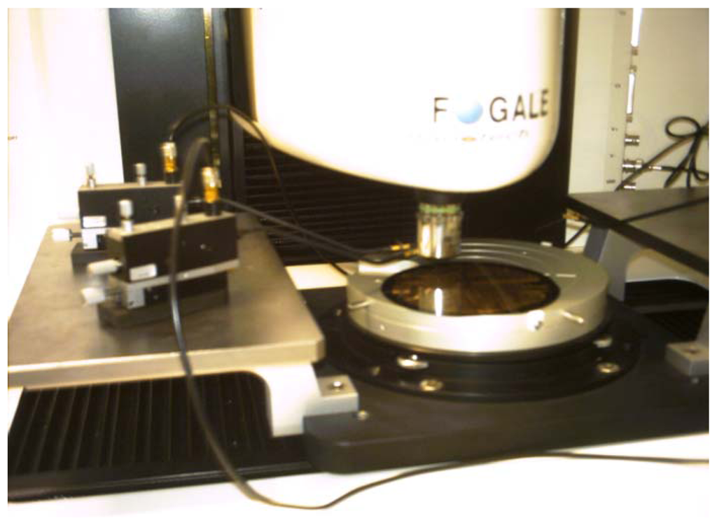The vibration of the microbeams is obtained by the electromechanical action induced by an electric field applied between the suspended structure and the ground. The profiling system is equipped with a power supplier capable of provide up to 200 Volt; adjustable needles assure connection between power supplier and circuit. These are mounted on the ProbeHeads PH100 Suss, which have a mobile arm and a pivot magnetically fixed on the work plane of the instrument (Figure 3). The needle tip is manually driven upon the connection pad on the structure by means of three screws, controlling the motion along the three directions.