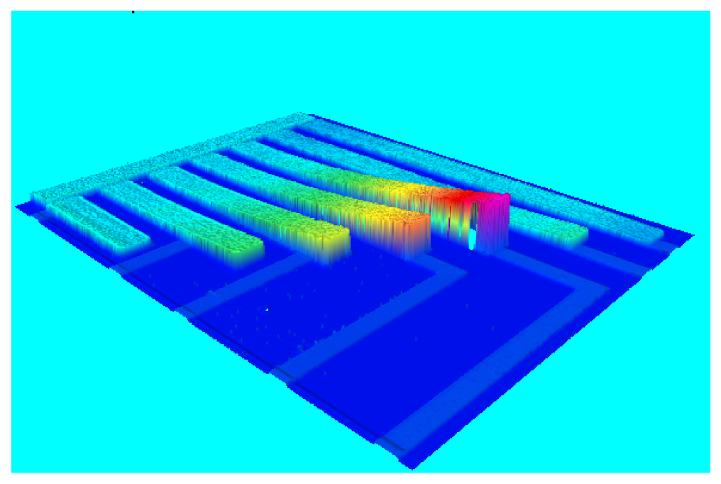 With the Fogale Zoomsurf 3D it is possible to obtain the frequency spectrum between 100 Hz and 2 MHz, applying the phase shifting interferometry technique [], based on the measure of interference fringes phase, as shown in the spectrum graph (Figure 5). A square portion located on the tip of the cantilevers is selected as measurement spot. The increase of the dc voltage at constant ac voltage brings the system to appreciable increase of amplitude and reduction of the natural frequency. The effect can be visualized with a shift on the left of the resonance peak on the spectrum graph (Fig. 5). Frequency shift was measured until the reaching of pull-in, which appeared strongly dependent on the beam curvature.