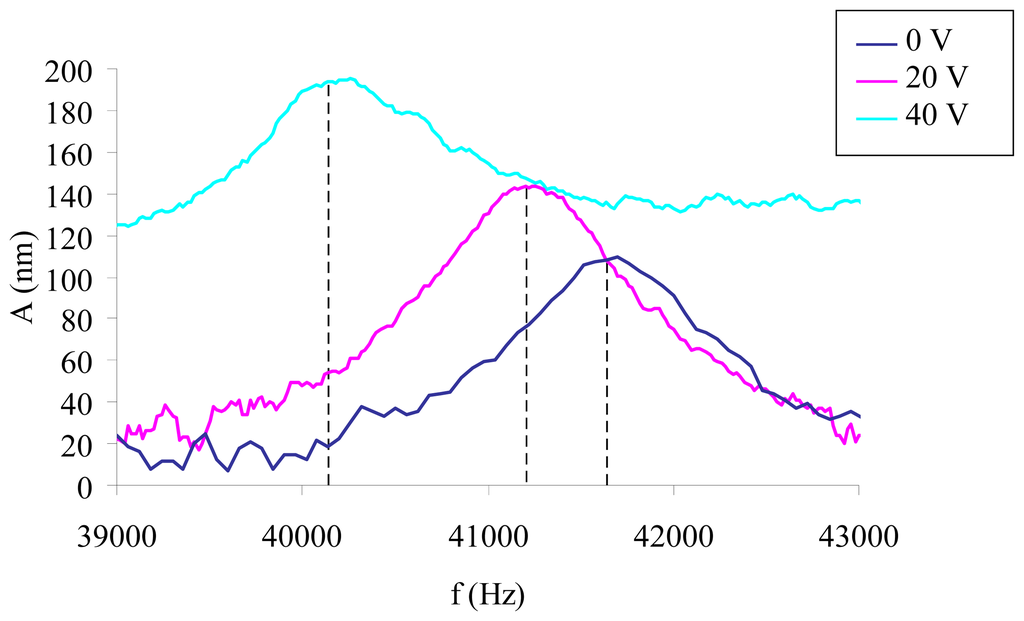 Experimental frequency spectrum of a microbeam with Vac=4.5V and three different values of DC voltage: 0V: fn=41640 Hz, Q= 43.4; 20V: fn=41230 Hz, Q=38.2; 40V: fn=40110, Q=35.9. Q factor was calculated with the half power method.