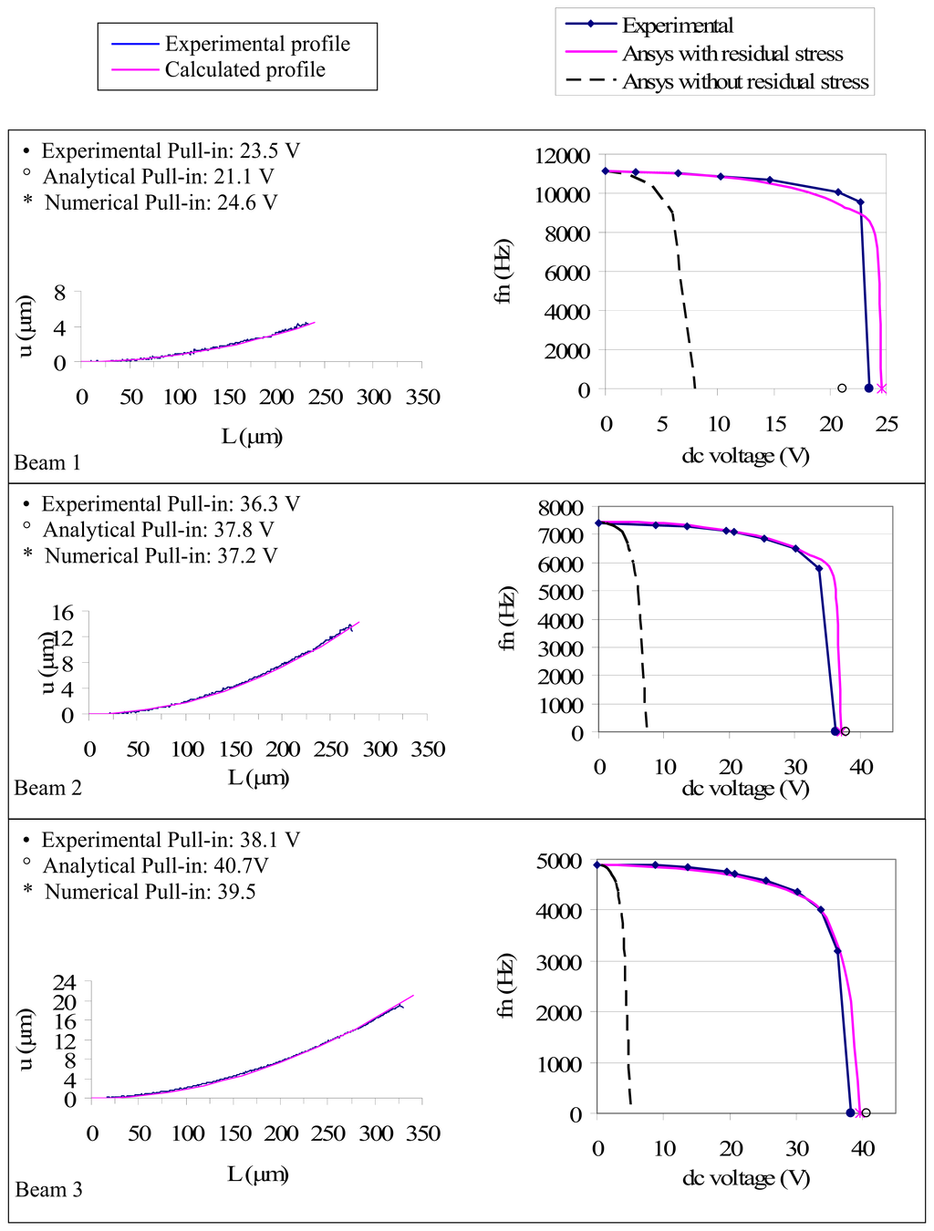 The experimental results were compared with FEM solutions from reduced order models using a specific capacitive element of ANSYS™ to model the electrostatic field. The residual stress effect on the structures was included in the models being necessary to determine the initial upward curvature and the correct pull-in tension value. The presence of stress gradient strongly influenced the frequency shift curve and the pull-in. The structures tested in this work were produced on two different wafers, in the first one beams of increasing length are grouped in sets. In the second wafer each set is composed by identical beams but thickness varies from one set to the other. The adherence with experimental measures varied from specimen to specimen, the biggest discrepancies appeared near pull-in, due to the high variability of this parameter in measures.
