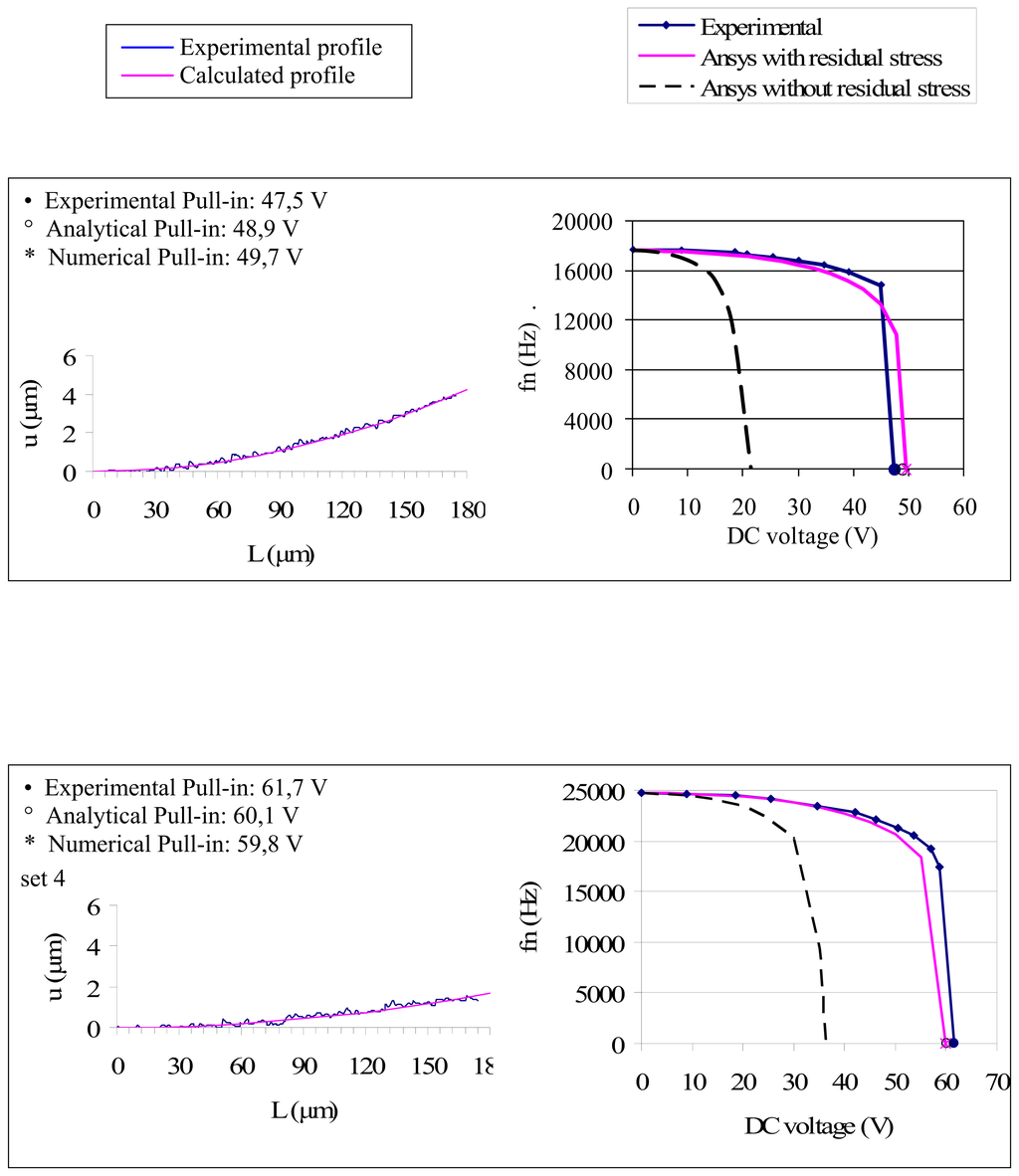 is calculated from equations (5) and (10) using experimental data, g0 is the gap in ideally flat conditions, also known from specimen profilometry. In Figures 7 and 8 a comparison between experimental and analytically calculated profiles of the upper side of the microbeams is presented. In Figure 7 specimens of wafer 1 are disposed by increasing length while in Figure 8 specimens of wafer 2 are disposed by increasing thickness.