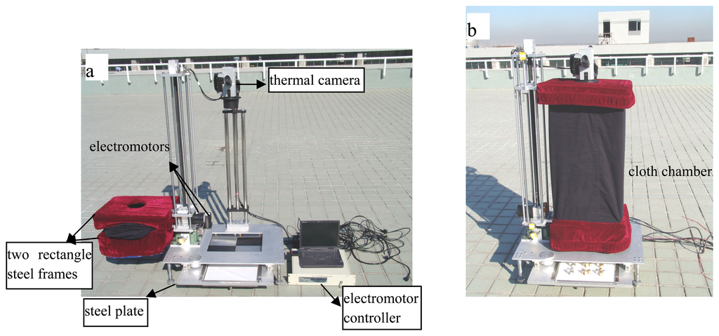 The instrument was designed to implement the above algorithm showed in Figure. 1. It is composed of four parts: a) horizontal moving equipments, mainly including a steel plate on which hollow reference box and the samples can be put on it in the experiment. This part is designed to control the horizontal moving of the steel plate and is used to put the sample and the reference box under the view field of the thermal camera alternatively; b) horizontal rotating equipments, mainly including two rectangle steel frames on which the cloth chamber is fixed. The upper one can move in vertical direction and the lower one is fixed at a constant height. There is a central hole on the top of the cloth chamber through which radiometric measurements can be taken. This part is used to make the cloth chamber rotate in horizontal 180 azimuth angle, which controls the alternation of ‘hot’ environment (inside the cloth chamber) and ‘cool’ environment (outside the cloth chamber, namely sky environment); c) vertical moving equipments, it controls the vertical moving of the upper steel frame and stretching the cloth chamber and making the ‘hot’ environment. The above three components are all made of stainless steel, which makes the instrument durable in the field experiments. All movements of the three parts are driven by electromotor, so there are total three electromotors in the system. d) automatic controlling equipments, including a notebook computer and an electromotor controller. It is mainly used to control the behaviors of the three electromotors and the observation of thermal camera by means of a C++ program.