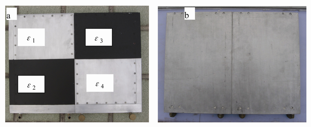 For calculating the ambient radiance, the reference boxes with known emissivities were used, which is shown in Figure.2. It consisted of two hollow boxes made of aluminium. One half upper surface of every box was sprayed with a layer of black lacquer with high emissivity about 0.98. The other half and its undersurface were polished to grey-white body with an average surface roughness of 2-5 urn which can give low emissivity about 0.3 without specular reflection. The first value of emissivity is given by the manufacturer of the black paint; the second one has been determined by means of a portable instrument for measuring emissivity which has been validated in previous applications (Patent no, ZL 02 1 23745.X). There is a hole on the upper surface of every box, through which water with some temperature can be poured into it to make the box an isothermal surface and to control the surface temperature of the box. The size of reference boxes is 0.4m length and 0.3m width, which is determined according to the installation height and view field of the thermal camera.