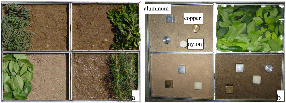 Another important component of the system is the sample plate. It is composed by four rectangle salvers; thereby different samples can be put in different salvers and can be observed at one time. Thus, using the thermal camera, spatial distribution of the thermal radiation of the samples can be obtained, which makes possible the study of the scaling behavior of the emissivity and the true surface temperature. Figure.3 shows two of the samples used in our experiments. In figure.3a, Silver sand with four different water content and some vegetation leaves were put in the salvers, where the lower-right soil is the wettest, the lower-left soil is the driest and upper-right soil is wetter than upper-left soil. In figure.3b, Silver sand, agricultural soil, vegetation leaves and wet sandy soil were put in the upper-left salver, lower-left salver, upper-right salver and lower-right salver, respectively, and some metal blocks made of aluminum, copper and nylon were inserted in the soils. Thus, the configuration of large emissivity difference was built up, which provides great benefit for validating the system and the study of the emissivity scaling.