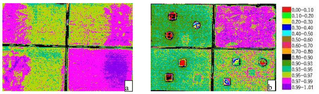 From Eq.(6) we can see that ambient radiance, B8–14 μm (Th) and B8–14 μm (Tc), must be calculated firstly. According to Eq.(2) or Eq.(5), there are two methods: (a) if the surface temperature of reference box, Tr, is known by measuring the temperature of the water inside, and in terms of the value of Mr, 8–14 μm (T1) and εr, 8–14 μm, B8–14 μm (Th) of every Pixel would be obtained using Eq.(2); (b) if Tr can't be acquired, using the difference between the emissivity of reference box painted in black lacquer and the emissivity of polished aluminium, two equations as Eq.(2) could be established for the same environment, based on which, the emittance from reference box and the average radiance from the environment can be solved. Similarly, B8–14 μm (Tc) can also be solved. Evidently, ambient radiance of every pixel can be obtained using the former method, but only average ambient radiance can be acquired using the latter method. It will produce different emissivity results using the two different ambient radiances due to the heterogeneity of ambient radiance. This problem will be discussed in detail in the following sections.