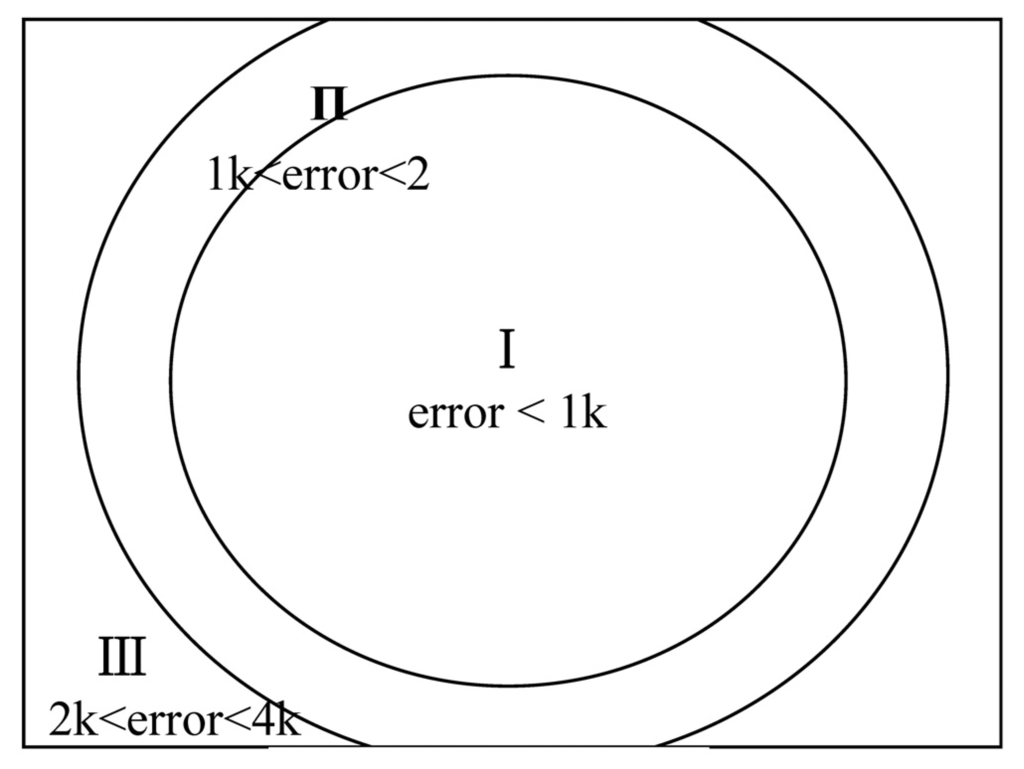 - M, the measured apparent radiance. The uncertainty in M is primarily from the thermal camera itself. Using the blackbody as the sample, we analyzed the characteristics of the thermal camera. Note that, in the measurements, although an auto-adjust function for correcting the temperature drift was set, there still was 4k drift errors at most in one regulating period, moreover, we found that there was almost no error for the central part of the thermal image, while with the increase of the distance from the central, the error increased and can reach 4k, that is to say, there are large errors for the pixels around the edge of the thermal image. According to the magnitude of the errors, the thermal image can be grouped into three regions as shown in Figure.5. The percentage (I) of drift error less than Ik was about 50% and the percentage (II and III) of the other two groups was about 25%, respectively. In order to reduce this error, in terms of the view field of the camera, we installed it at height of 1.3m to make the sample locate in the region of I and II. At the same time, we also calibrated the thermal camera using the blackbody in the experiments.