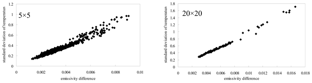 According to the design of reference box, there are four sub-pixels, ε1=0.3, ε2=0.98, ε3=0.3, ε4=0.98, a1=a2= a3=a4=0.25, T1=T2, T3=T4. Calculation results show that the magnitude of Δ ε linearly depends on the temperature difference of sub-pixels (T1 – T3). From figure.7, we can see that Δε increases with increase of T1 – T3. When T1 – T3 equals to 38k, Δ ε can reach 0.04, which will produce large errors in surface temperature retrievals. Furthermore, using the emissivity retrievals of combinations of soils and vegetations, we obtained the similar linear results. There are total 240×180 pixels in a thermal image, correspondingly, there are 240×180 surface emissivity values. By integrating pixels of 5×5, 20×20, respectively, we obtained figure.8a and figure.8b, where we used standard deviation of surface temperatures to express the heterogeneity of measured objects. Clearly, the more heterogeneity of the surface is, the larger emissivity difference is. 1.0 deviation of temperature results in about 0.01 emissivity difference. Therefore, Δε must be evaluated and be corrected to fulfill the emissivity scaling.