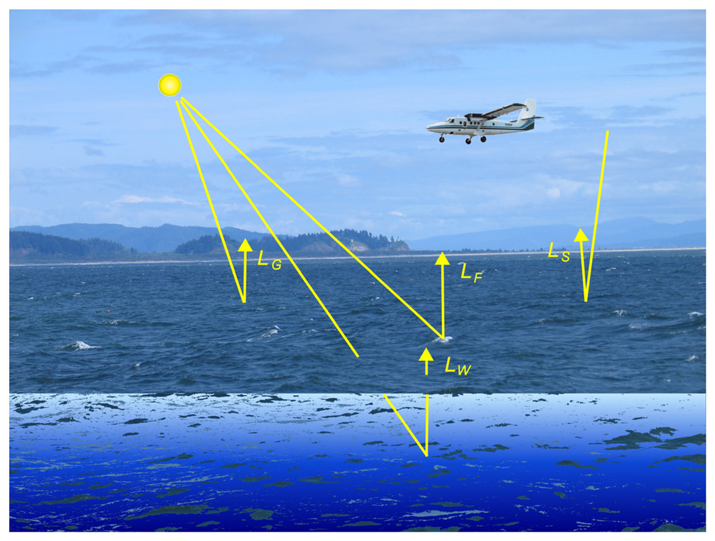 where LW is the water-leaving radiance propagating in the zenith direction and E is the irradiance incident on the surface. Where multiple scattering in the atmosphere is negligible, the zenith-propagating radiance measured at the aircraft is the sum of the water leaving radiance and contributions from surface reflections. For each wavelength, this can be expressed as: