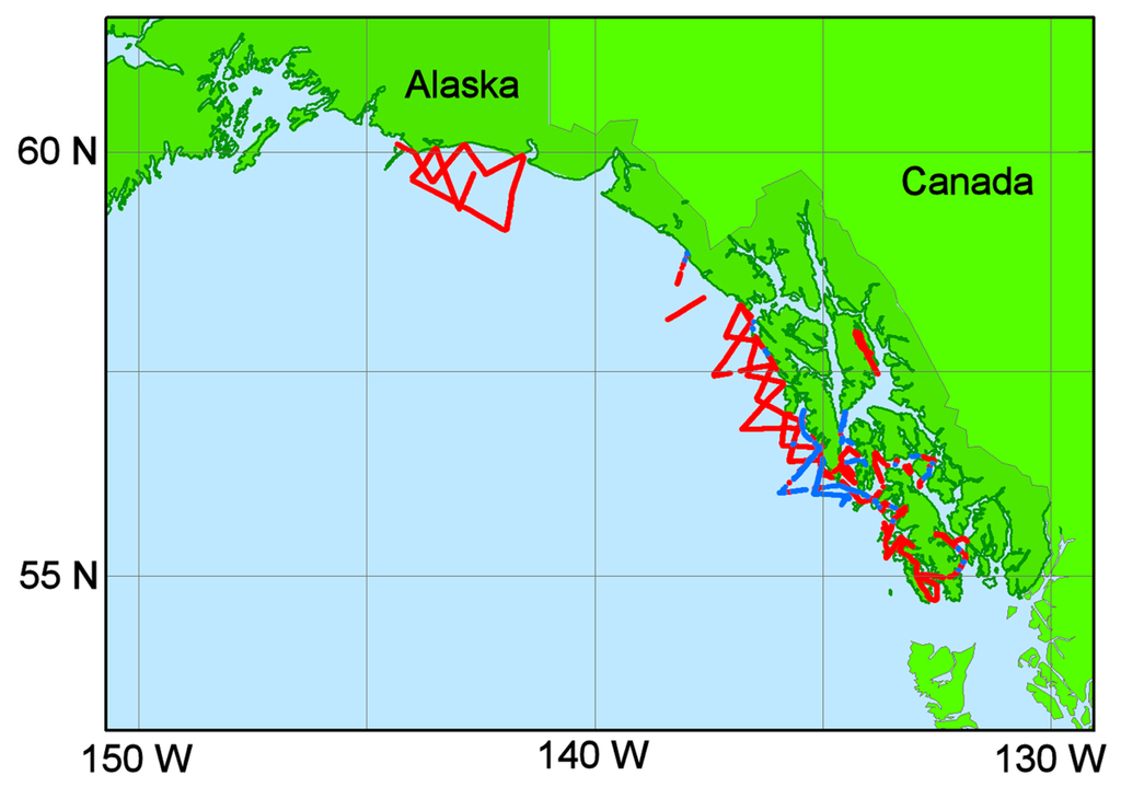 Chart of S.E. Alaska showing locations of clear (red) and cloudy (blue) measurements along flight tracks.