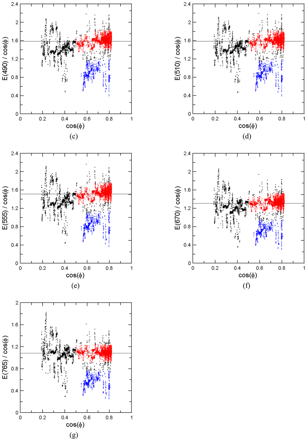 Measured downwelling irradiance E(λ) in W m-2 nm-1 divided by the cosine of the solar zenith angle ϕ. Horizontal line represents the median value of all data. Black data points were rejected for reasons described in the text, so only the red (clear sky) and blue (cloudy sky) data points were used in the averaged spectra. a) λ = 412 nm. b) λ = 443 nm. c) λ = 490 nm. d) λ = 510 nm. e) λ = 555 nm. f) λ = 670 nm. g) λ = 765 nm.
