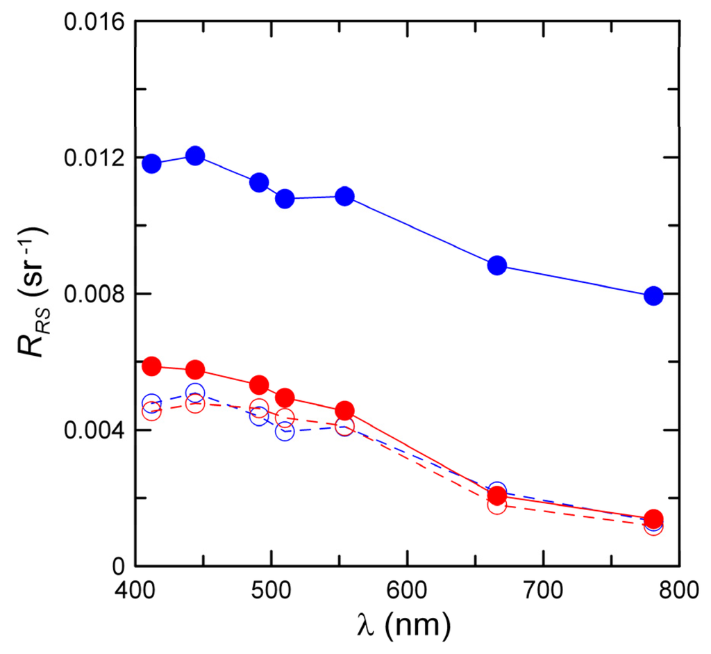 Measured (solid circles) and corrected (open circles) remote sensing reflectance RRS for clear (red) and overcast (blue) skies.
