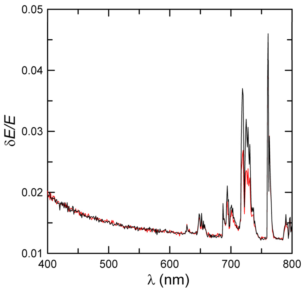 Relative error in estimate of surface irradiance δE/E produced by measuring irradiance at 150 m. Curves represent MODTRAN maritime models for tropical (black) and sub-arctic winter (red) atmospheres.