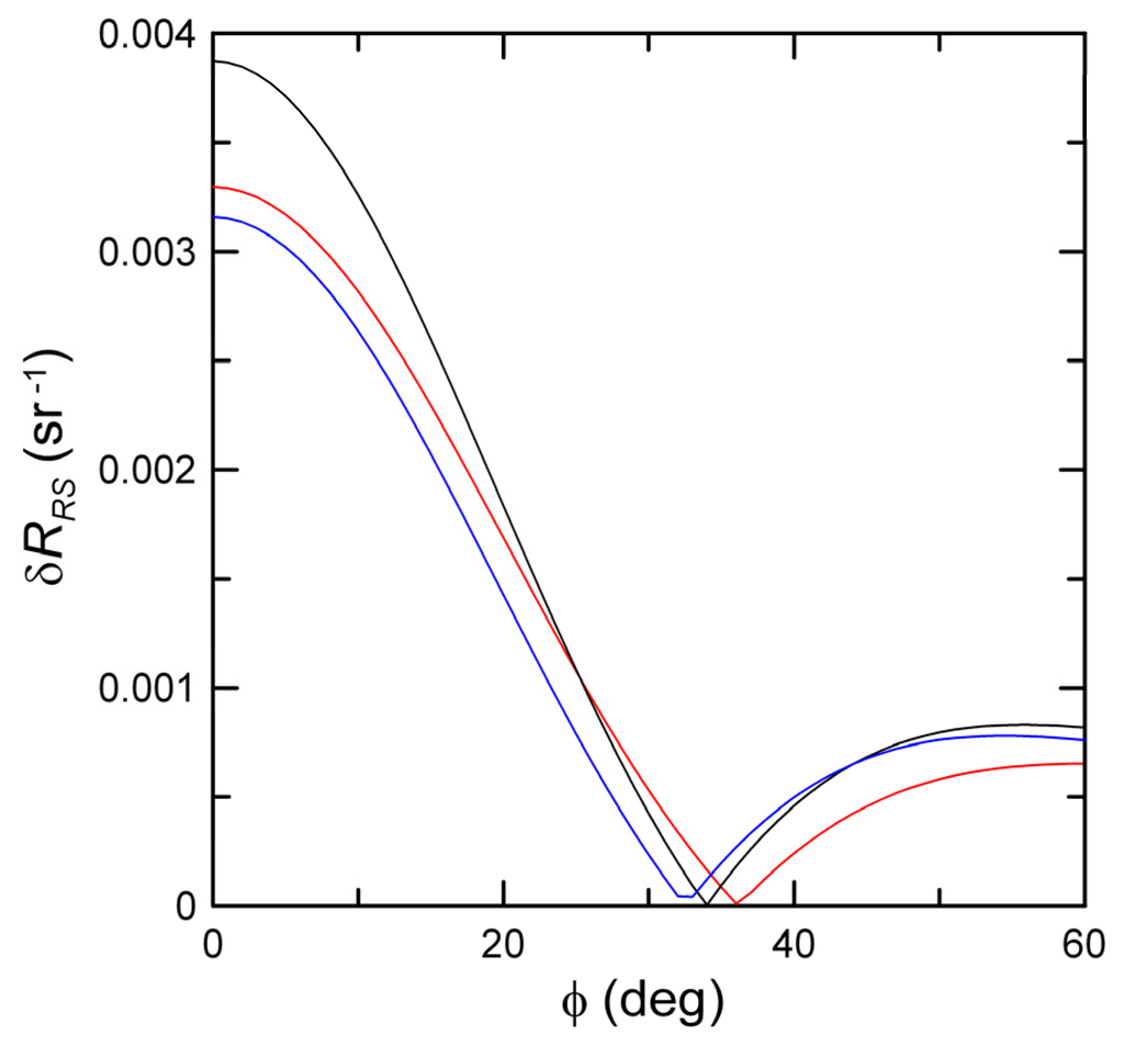 Estimated remote-sensing-reflectance error δRRS for error in the glint correction caused by a 1 m s-1 error in estimating the wind speed (black), a 0.5° C error in estimating air/sea temperature difference (red), and the uncertainty in the Cox-Munk model for surface-slope variance (blue) plotted as a function of the solar zenith angle ϕ.