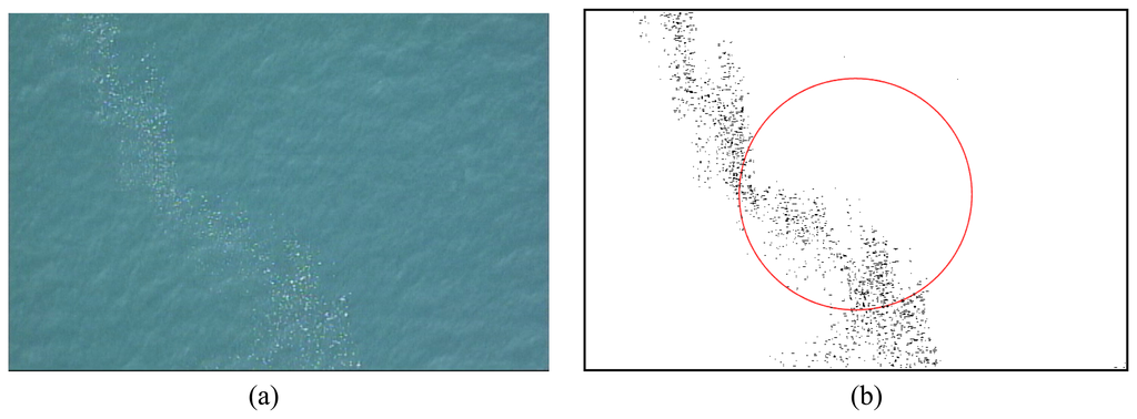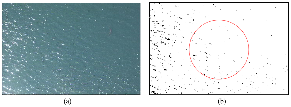 Video frame with sun glints. a) color image. b) negative of binary image with red circle denoting field of view of radiometers.