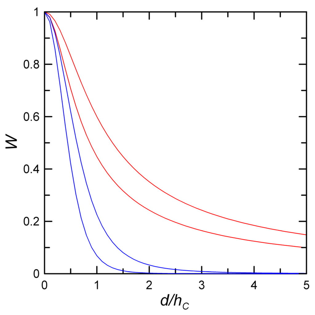 Relative radiance weighting W of a point on the bottom of a cloud as a function of the horizontal distance from the receiver to that point d over the cloud base height hC for the actual radiance reflected off the surface (blue) and the estimate from the measured irradiance (red). The upper and lower red curves correspond to an aircraft flight altitude of 0.25hC and 0.5hC, respectively. The upper and lower blue curves correspond to root-mean-square surface slopes of 0.3 (wind about 20 m s-1) and 0.2 (wind about 9 m s-1), respectively.