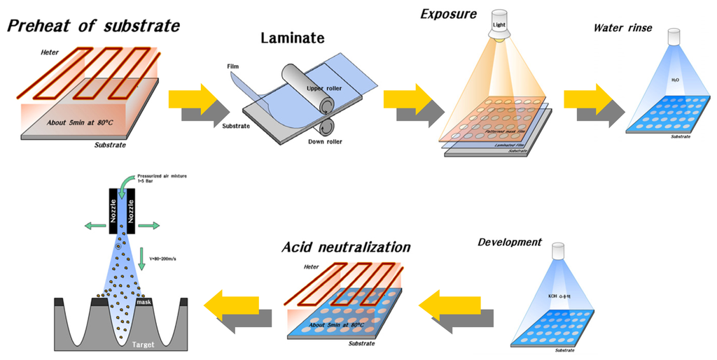 The overall fabrication process for a LGP mold with micro pattern using powder blasting is illustrated in Figure 2. Prior to this process, pattern design and pattern mask making processes are required. Through the masking process, mold regions to be removed by the powder blasting are determined. Finally, the desired micro dot pattern forming injection mold for the LGP can be obtained after the powder blasting and cleaning processes.