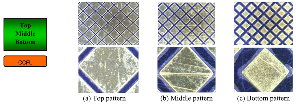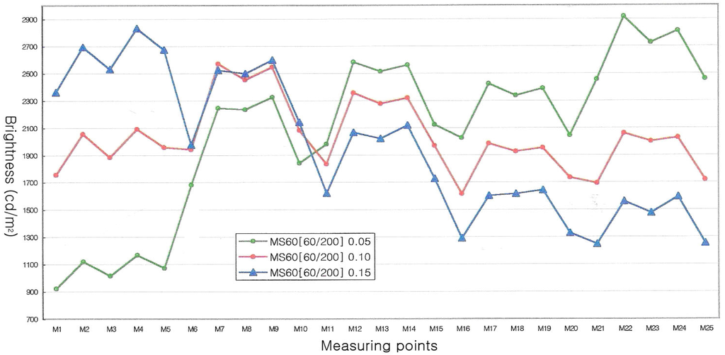 Variations of brightness versus three different blasting pressures are shown in Figure 9. Uniform brightness distribution can be obtained at 0.1MPa blasting pressure. At 0.15MPa blasting pressure, the closer the distance between the CCFL and measuring points becomes, the higher brightness becomes. At 0.05MPa blasting pressure, on the other hand, this trend is reversed. This phenomenon can be applied to obtain higher uniformity and higher brightness by varying the blasting pressure according to the target point locations on the LGP mold.