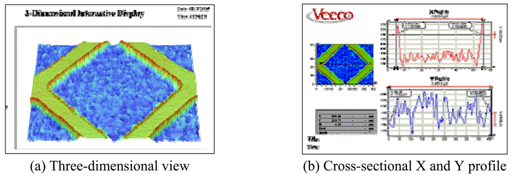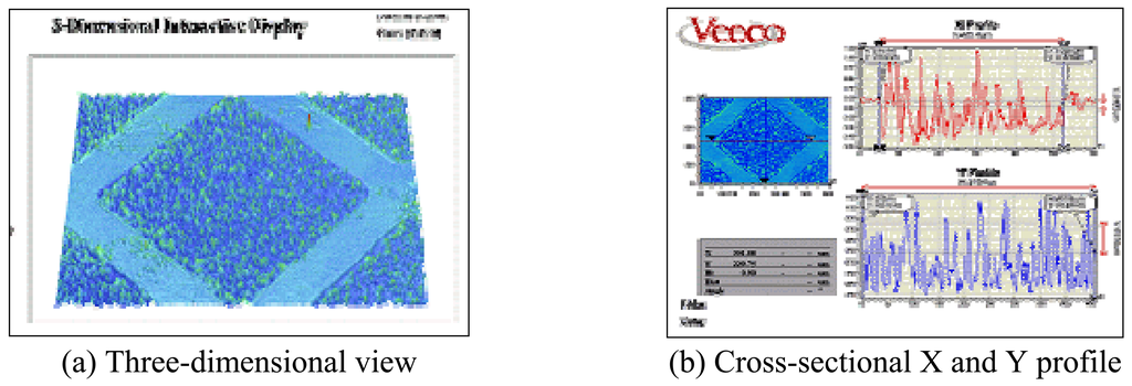 Three-dimensional shape analysis results for square-type dot mold patterns machined via powder blasting are shown in Figure 4. Figure 4(a) represents the three-dimensional shape, and Figure 4(b) represents the cross-sectional shape of the machined pattern. In the Figures, clearly formed square-type dot patterns and uniformly distributed minute burrs can be observed. However, such burrs are not expected to cause significant problems in the actual injection process for the LGP.