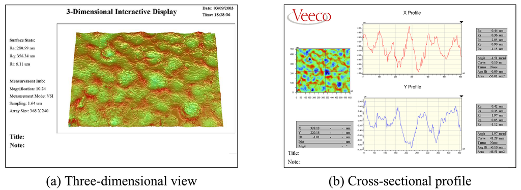 In this study, the matte finished surface shapes are investigated under various blasting parameters to obtain the optimum conditions. Figure 6 shows one of the best matte finished surface shape and the cross-sectional X and Y profile. Uniformly distributed waviness on the mold surface can be observed.