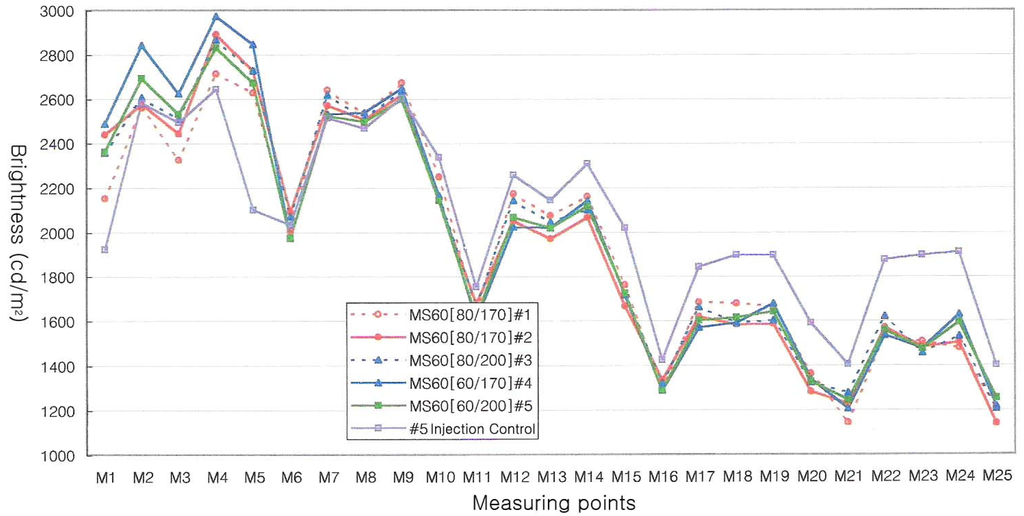 The effectiveness of the matte finishing can be investigated from the optical characteristics of the injected LGP using the mold fabricated via the powder blasting under the optimized process conditions. Twenty five positions for measuring brightness are sampled as shown in Figure 7. Figure 8 shows variations brightness measured at 25 points versus 5 powder blasting conditions and 1 controlled injection condition. The average brightness values of the sampled 25 points for 5 different blasting conditions are 1,900-2,000cd/m2. Final average brightness after optimizing injection parameters is 2,053cd/m2. From Figure 7 and Figure 8, it can be seen that the closer the distance between the CCFL and measuring points becomes, the higher brightness becomes. These results should be improved in order to obtain more uniformly distributed brightness for entire surface.