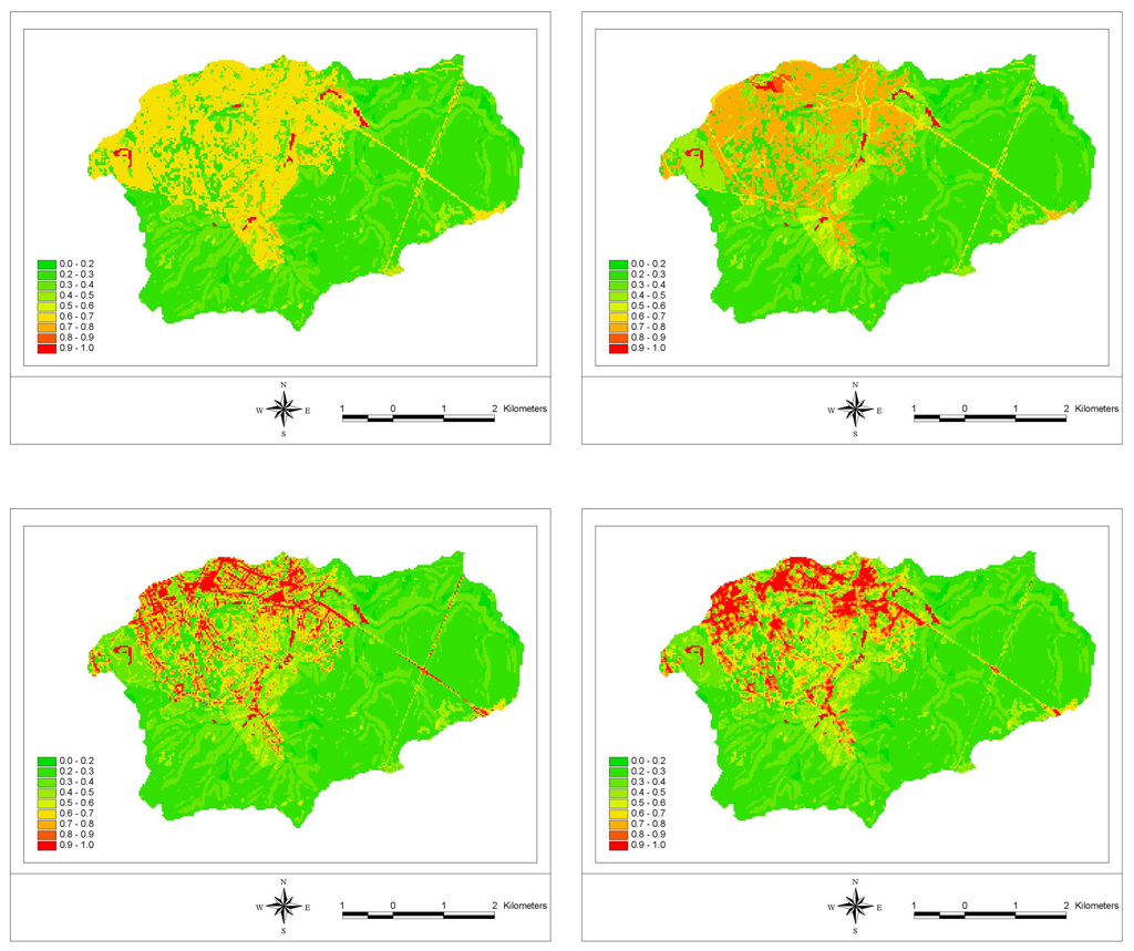 Runoff coefficient maps for scenario 1 (upper left), scenario 2 (upper right) and scenario 3 (lower left), based on Ikonos-derived land-cover data, and for scenario 3 (lower right), based on Landsat ETM+-derived land-cover data.