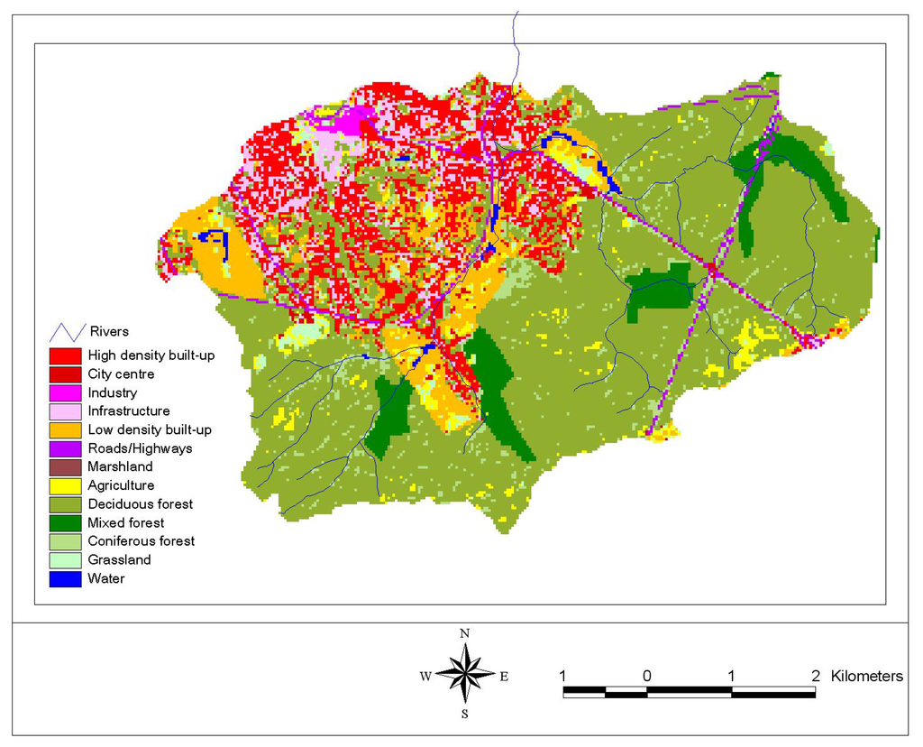 The land-use map of Flanders, produced by the Agency for Geographic Information Flanders (AGIV), was used as a reference data set to characterize land use within the study area. The map distinguishes 13 land-use types and was obtained using a hybrid approach combining interpretation of Landsat TM data with existing vector data sets (topographic maps, waterways, soil type, CORINE land-use data) for improvement of the original interpretation and for increasing the number of thematic classes. Dominant land-use types in the study area (Figure 2) are deciduous forest (55 %), urban area (29 %), coniferous forest (4 %) and mixed forest (6 %). Agriculture, grassland, marshland and open water cover 6 % of the total area. The urban part of the study area includes high density built-up area (12.7 %), low density built-up area (8.2 %), infrastructure (5.6 %), roads and highways (1.9 %), industrial land use (0.5 %), and also covers a very small part of the city centre (0.2 %). The original land-use map has a resolution of 20 m. For modeling purposes it was resampled to the 30 m cell size of the Landsat ETM+ data. A DEM with 30 m resolution was constructed from elevation contours and the river network. The elevation contours for every 2.5 m and the river network were digitized from topographic maps at a scale of 1:10,000. The DEM was generated in ArcInfo using TOPOGRID [34]. A digital soil map of the study area was obtained from AGIV and converted into 12 USDA soil texture classes based on textural properties.