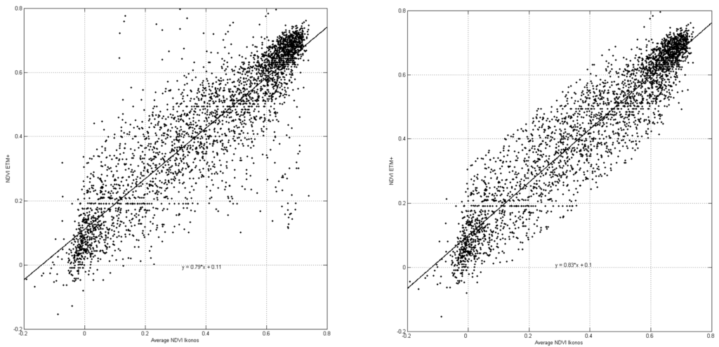 The relationship between the Ikonos and ETM+ NDVI values was approximated by linear regression analysis, with the NDVI of the ETM+ pixels as the dependent variable. The resulting correlation coefficient of 0.88 indicates a strong linear relation. Next, all pixels with a residual value more than two times the standard deviation of the residuals were removed. This reduced the number of samples from 3288 to 3118 and improved the correlation to 0.94 (Figure 3, right). Subsequent iterations of best linear fitting and outlier removal only marginally improved the correlation.