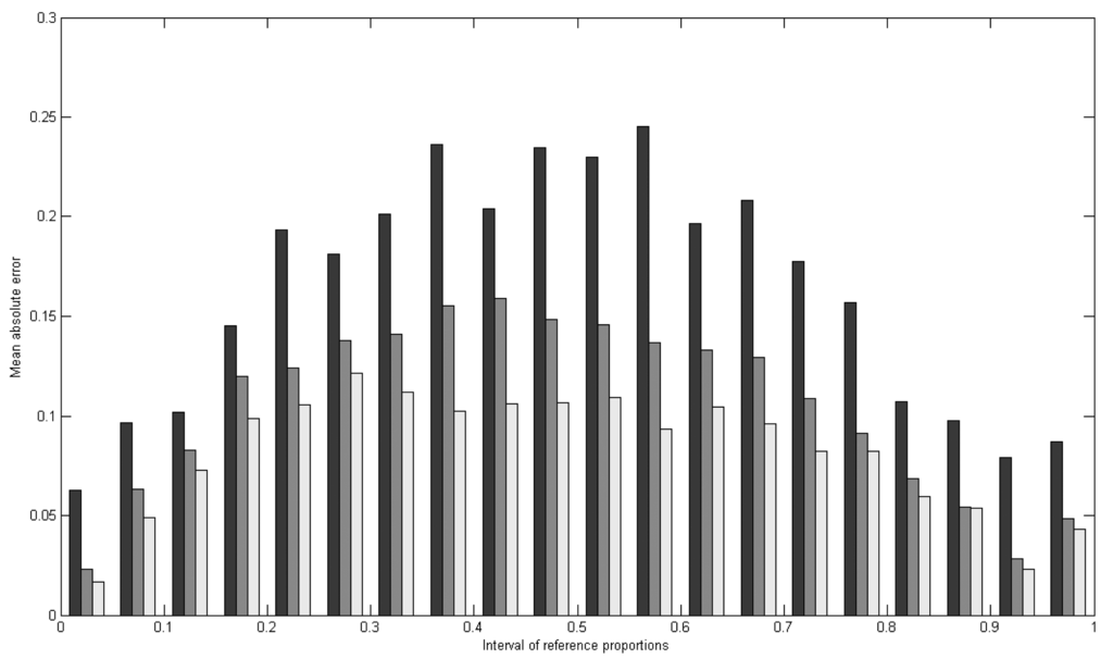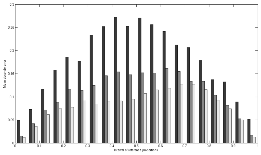 Mean absolute error (MAECj) for vegetation for different intervals of reference proportions and for different levels of aggregation (black: 30 m, grey: 60 m, white: 90 m).