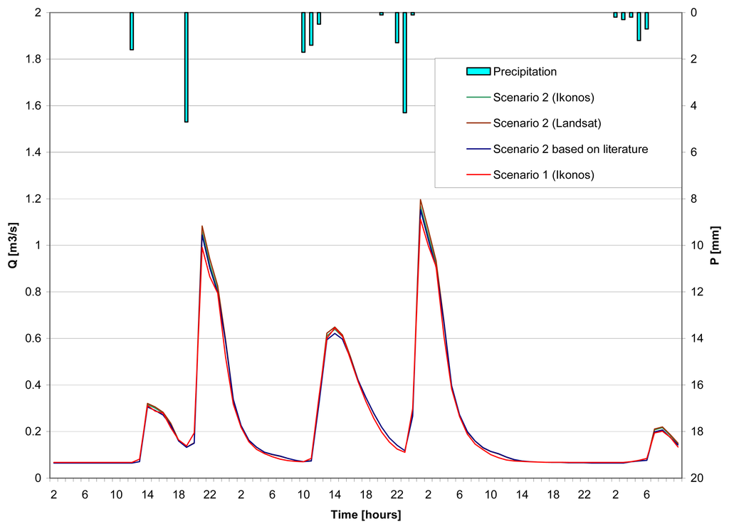 The hydrograph simulated in scenario 3, but based on Landsat ETM+ data, has lower peak values than the one based on Ikonos data (Figure 10). In fact, estimated peak discharges based on the use of Landsat ETM+ data for scenario 3 are very similar to the estimates that were obtained with scenario 2. This is most likely due to a smoothing effect in the distribution of impervious surface proportions caused by the sub-pixel classification process, with a direct impact on the spatial variation of runoff coefficient values [49]. The result suggests that sub-pixel estimation of land-cover class proportions based on Landsat ETM+ data is less accurate than high-resolution remote sensing for modelling the spatial distribution of runoff at 30 m cell size. However, if high-resolution data are not available or if resources are limited, the technique may be very useful to account for spatial variation in runoff.