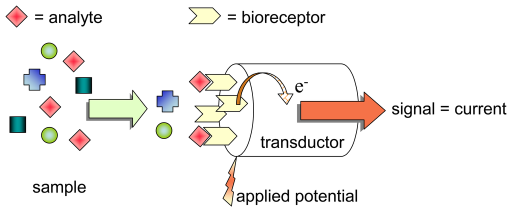 Among electrochemical biosensors, the oldest ones, which have led to the higher number of ready-to-use devices, are based on the monitoring of electron-transfer processes, thus belonging to the amperometric category. This review will centre on this group. The signal of these biosensors is generated by the electron exchange between the biological system in the bioreceptor layer and one electrode. Generally speaking, when using amperometric biosensors, the analyte undergoes, or is involved, in a redox reaction that can be followed by measuring the current in an electrochemical cell. The analyte, or the species involved with it via a (bio)chemical reaction, changes its oxidation state at one electrode. The electron flux is then monitored and is proportional to the amount of the species electrochemically transformed at the electrode. Figure 1 depicts the working principles of an amperometric biosensor.