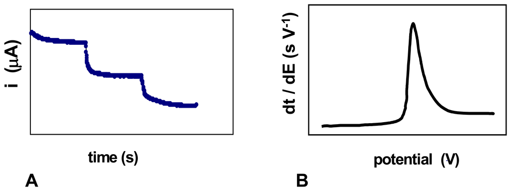 Other electrochemical techniques, based on the electrochemical oxidation/reduction of species directly or indirectly involved in the recognizing biological reaction have been used when dealing with electron-transfer based biosensors. For example, it is possible to follow the amount of a species that is electro-transformed at one electrode by monitoring the time taken to perform such a reaction, when working at constant current, and varying the electrode potential. Fig. 2B depicts a typical curve obtained when carrying out one of these experiments, named potentiometric stripping analysis. The peak area is proportional to the time necessary to electro-transform a species attached to the electrode, which, for example, may be directly proportional to the analyte concentration.