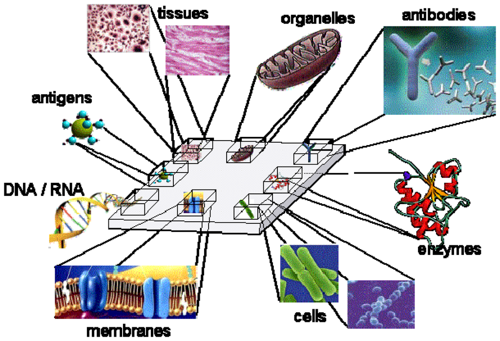 The bioreceptor layer is responsible for the selectivity/specificity of the device and, in principle, any biological or biologically derived element can be used. Figure 4 summarizes the different bioreceptors we can use to achieve the desired selectivity, according to the nature of the analyte.