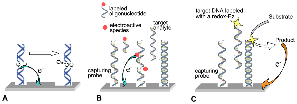 DNA-based biosensor arrangements. (A) Direct detection of DNA by electro-oxidation of guanine using an electrode poised at a convenient potential. (B) Electrochemical detection of DNA hybridisation using an electrochemical mediator for the oxidation of guanine species, which bounds to the nucleic acid probe, and is afterwards electro-transformed. The signal reduces as the analyte concentration increases. (C) Electrochemical detection of DNA hybridisation using an oligonucleotide modified with a redox enzyme (Ez). The signal increases upon adding the enzyme substrate, once hybridisation took place.