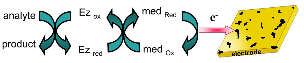The second tactic to avoid interfering reactions consists of working with systems that use electrode potentials at which interferences are not efficiently oxidized/reduced, which can be achieved by using electrochemical mediators [121-125]. Electrochemical mediators commonly used are chemicals displaying a higher kinetic constant for the electron transfer process at the electrode than that of the product selected to monitor the enzymatic reaction. Thus, the electro-transformation of the mediator (med) is favoured, as compared with that of the product of the enzymatic reaction. These compounds usually act as enzyme (Ez) co-substrates mediating the charge transport between the biological recognition element and the electrode, therefore rendering a catalytic cycle, as described in Fig. 7.