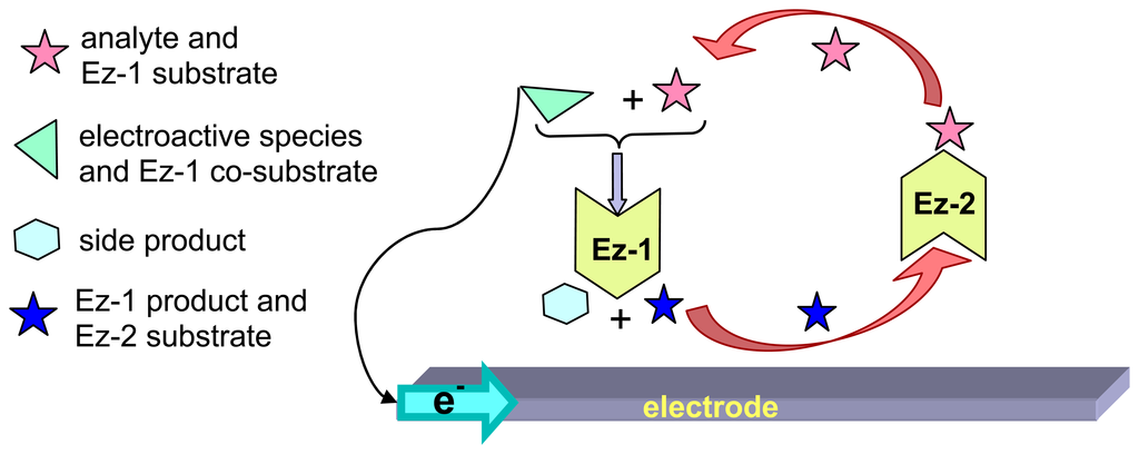 - Amplifying the electron exchange process at the electrode surface using coupled enzymatic systems. In this approach, the analyte (or one analyte-related species), is the substrate of the first enzyme (Ez-1). The analyte and the Ez-1 co-substrate, which is the electro-active species, react with Ez1 to render the products, one of which is the Ez-2 substrate (Fig. 8). Ez-2 reacts with its substrate to regenerate the analyte (or the analyte-related species), thus enabling its recycling to keep consuming Ez-1 co-substrate, this latter one being electrochemically detected. Therefore, even tiny amounts of the analyte can be detected because the consumption of the electroactive species is supported by the cyclic reaction of both enzymes.