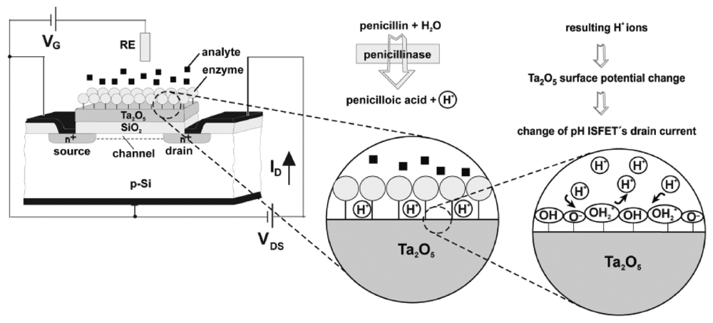 - Caras, S.; Janata, J. Field-effect transistor sensitive to penicillin. Analytical Chemistry 1980, 52(12), 1935–1937. [Google Scholar]